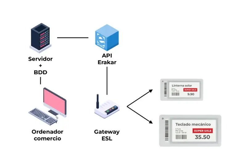 El sistema de etiquetado electrónico ESL de ERAKAR se basa en una arquitectura distribuida cliente-servidor, diseñada para garantizar fiabilidad, baja latencia y facilidad de despliegue.
